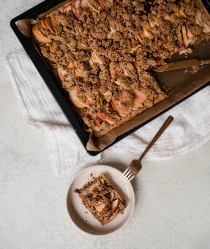 Sophie, unsere Produktentwicklerin, hat dafür nur wenige Zutaten verwendet, die man auch ganz einfach variieren kann. So lassen sich anstatt Äpfeln, auch Zwetschgen oder Kirschen verwenden. Und wer den Kuchen nussfrei backen möchte, verwendet einfach Erdmandeln anstelle Mandeln.