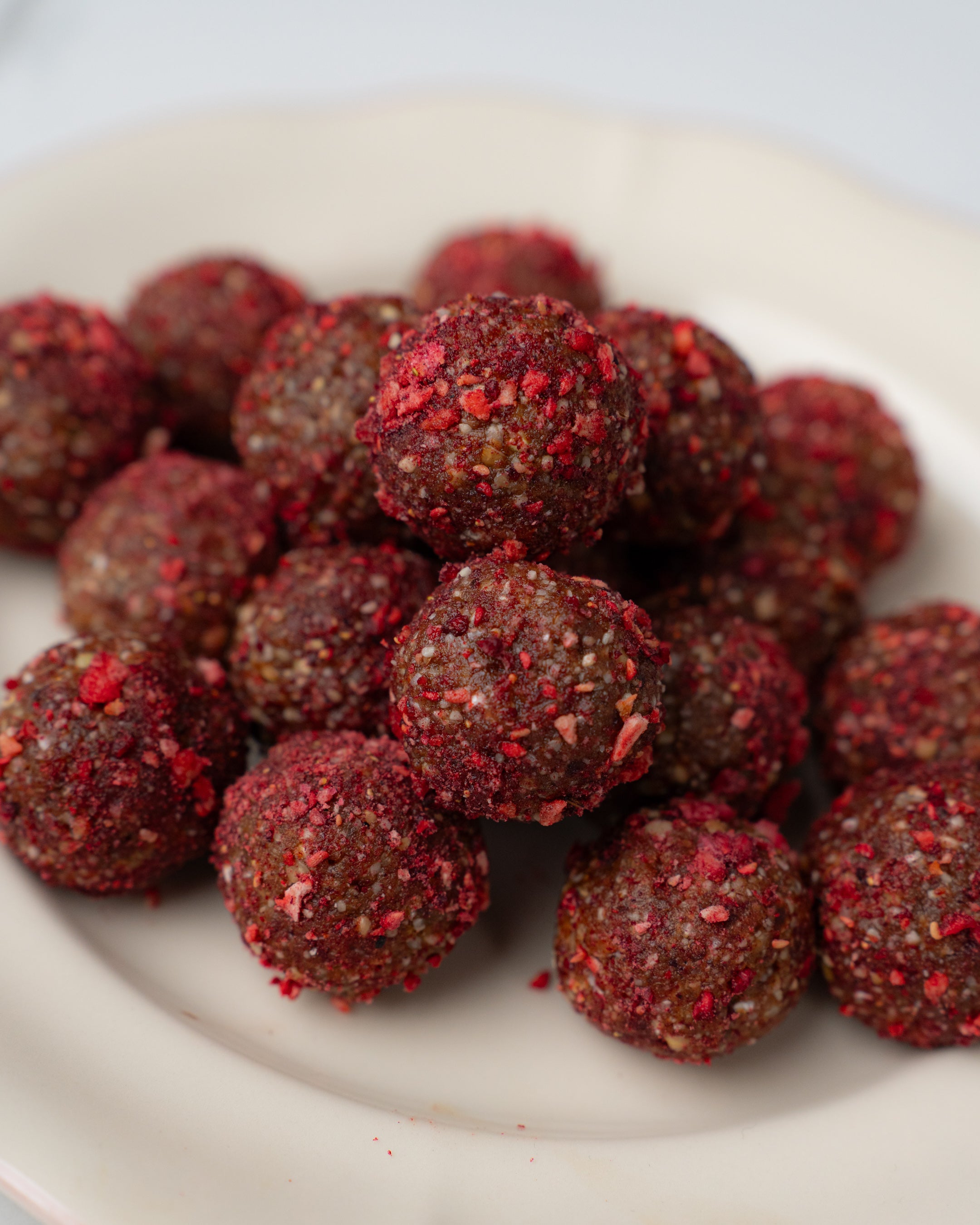 - Mit den Händen kleine Kugeln formen und in gefriergetrockneten Beeren wälzen.