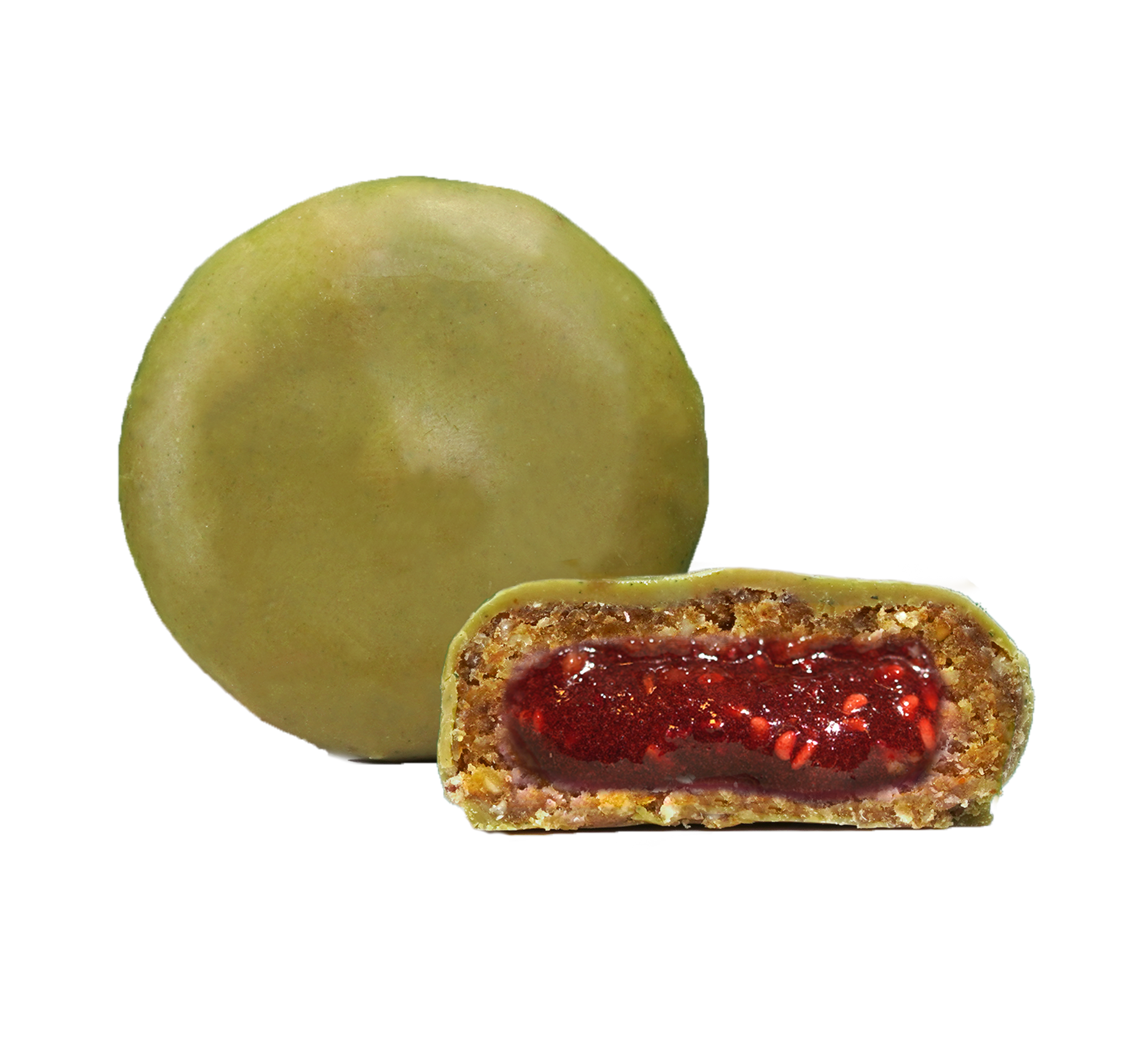 Eine zartschmelzende Hülle aus Ceremonial Grade Matcha-Schokolade trifft auf eine saftige Dattel-Nuss-Schicht mit fruchtiger Himbeerfüllung – für deinen ganz persönlichen Perfect Match(a) Moment!