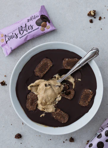 Die Keksmasse besteht neben Kichererbsen aus pflanzlichem Quark, unserem karamelligen Cashew-Spread sowie einem Haselnuss Pralini.