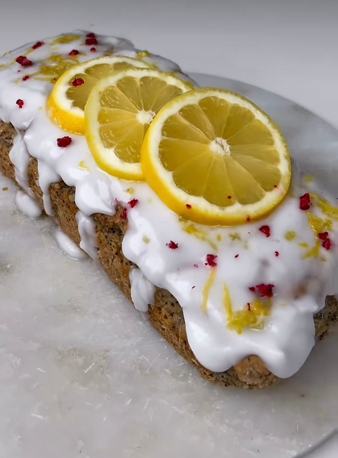 7. Etwa 1-2 EL Birkenpuderzucker mit ein wenig Zitronensaft vermischen, um eine Puderzuckerglasur anzurühren. Die Glasur auf dem abgekühlten Kuchen verteilen, mit gefriergetrockneten Himbeeren und Zitronenscheiben dekorieren und genießen!