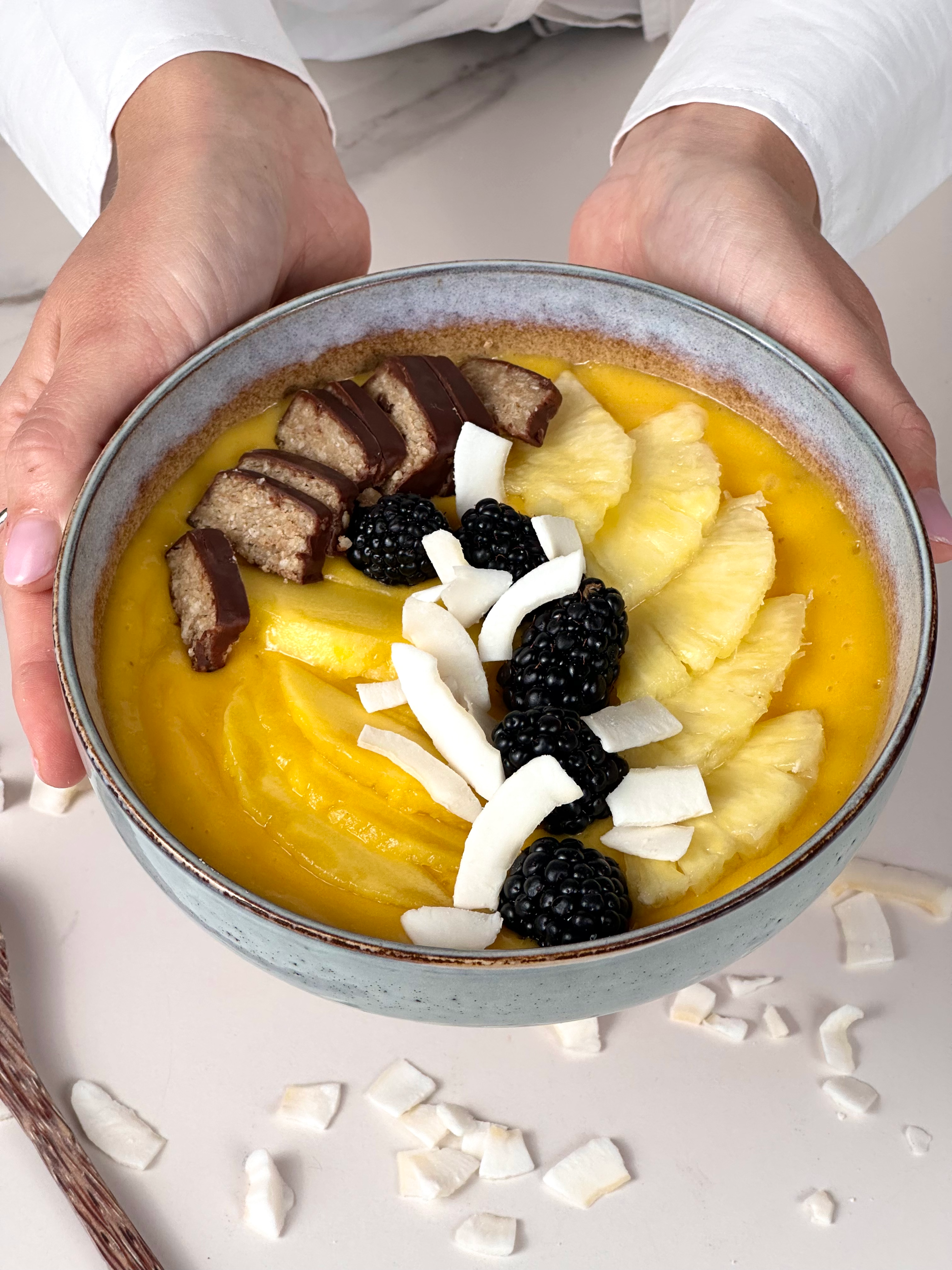 Bali voelt zich thuis! Met deze supereenvoudige en verfrissende tropische smoothie bowl kun je alleen maar in een goed humeur zijn!🥭🥥