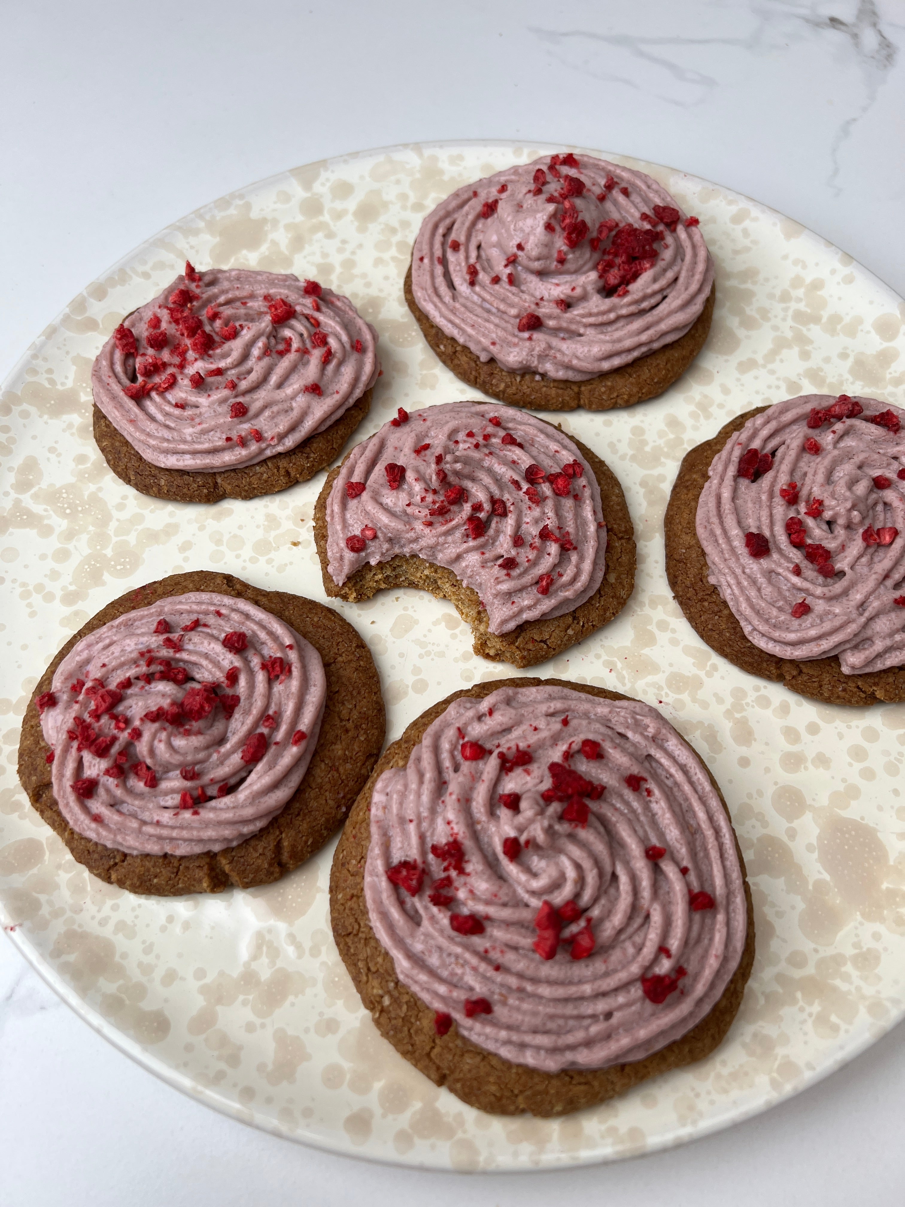 4. Die Erdbeercreme in eine Spritztülle füllen und damit die Cookies toppen.