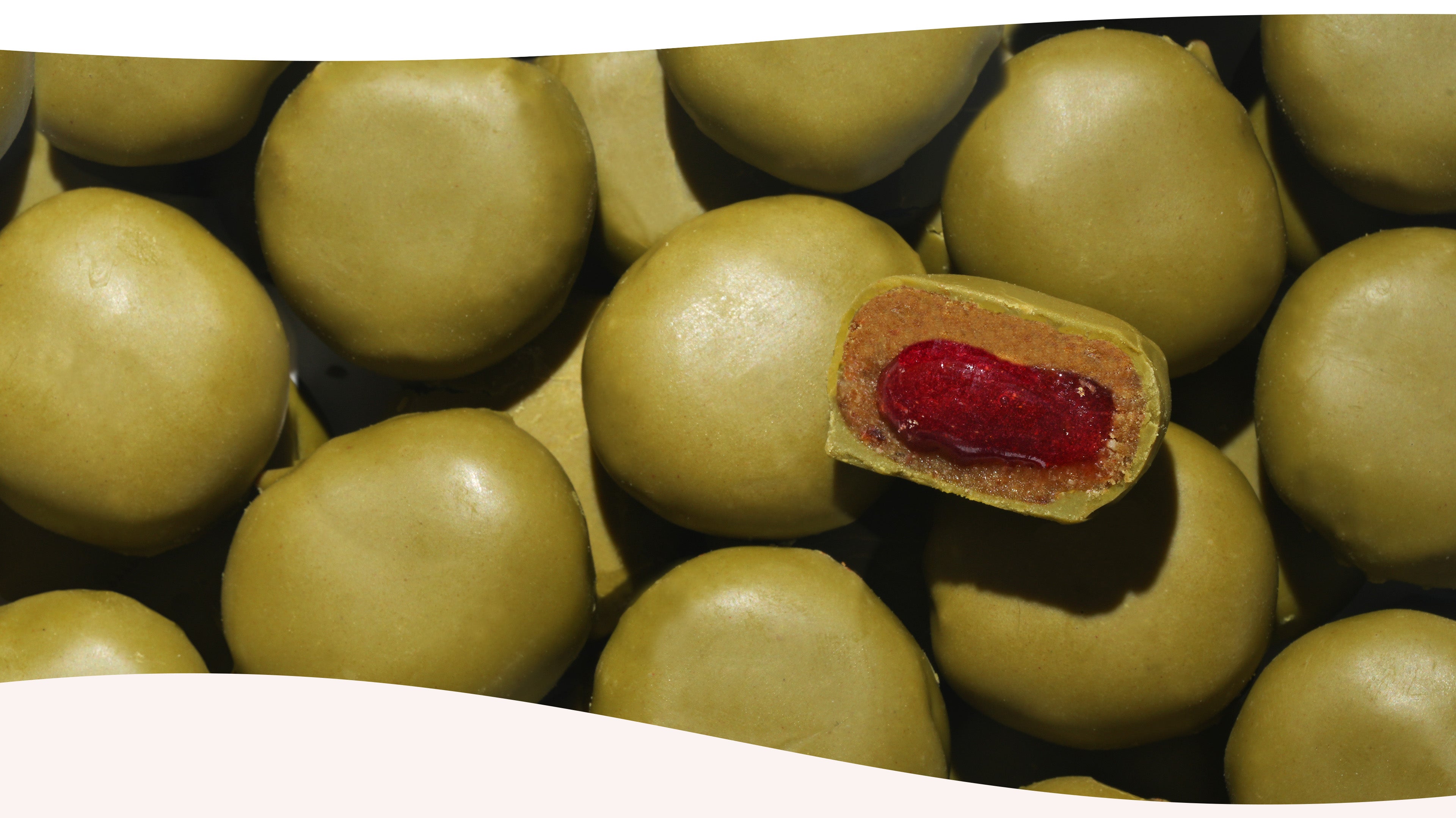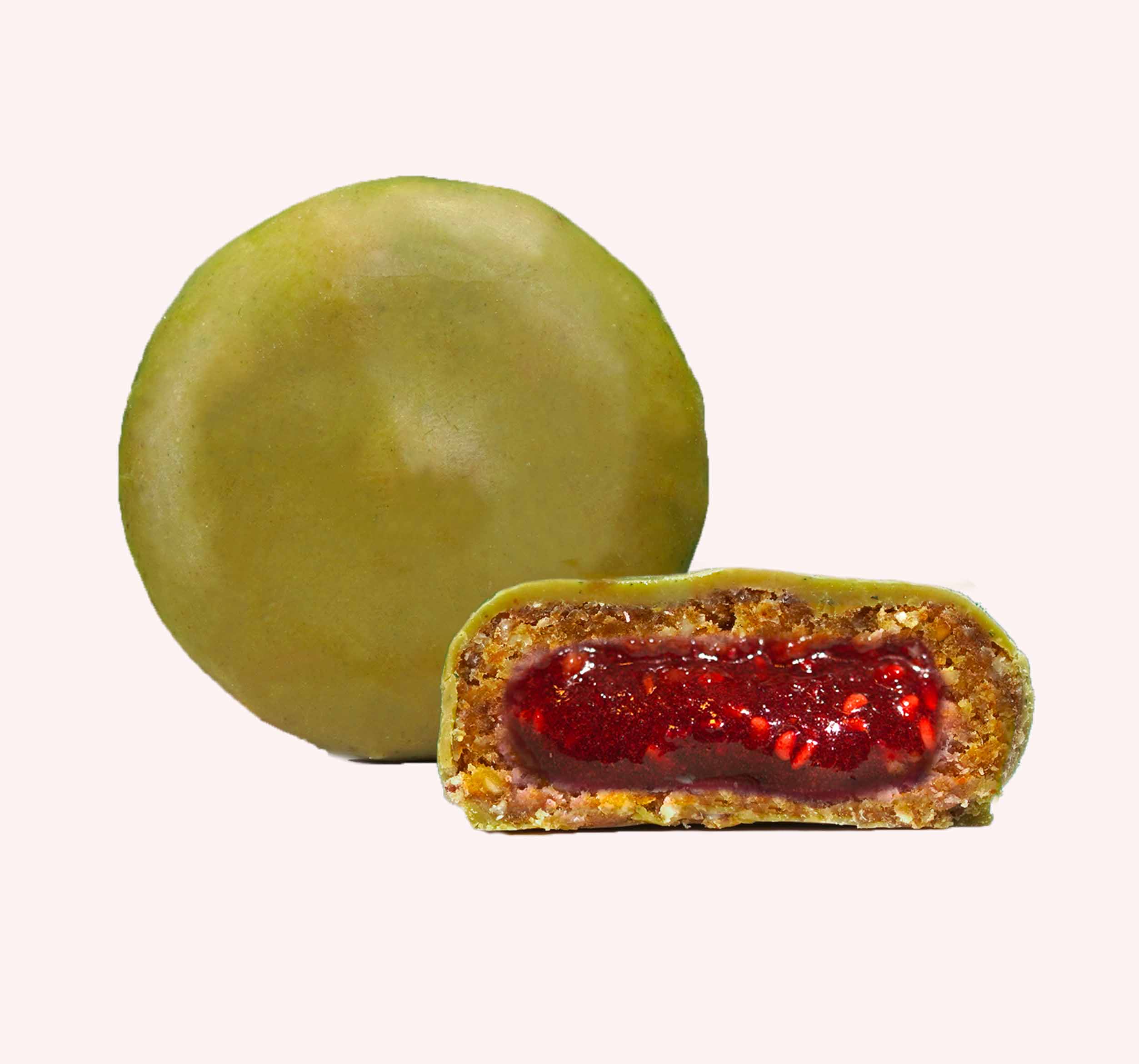 Eine zartschmelzende Hülle aus Ceremonial Grade Matcha-Schokolade trifft auf eine saftige Dattel-Nuss-Schicht mit fruchtiger Himbeerfüllung – für deinen ganz persönlichen Perfect Match(a) Moment!