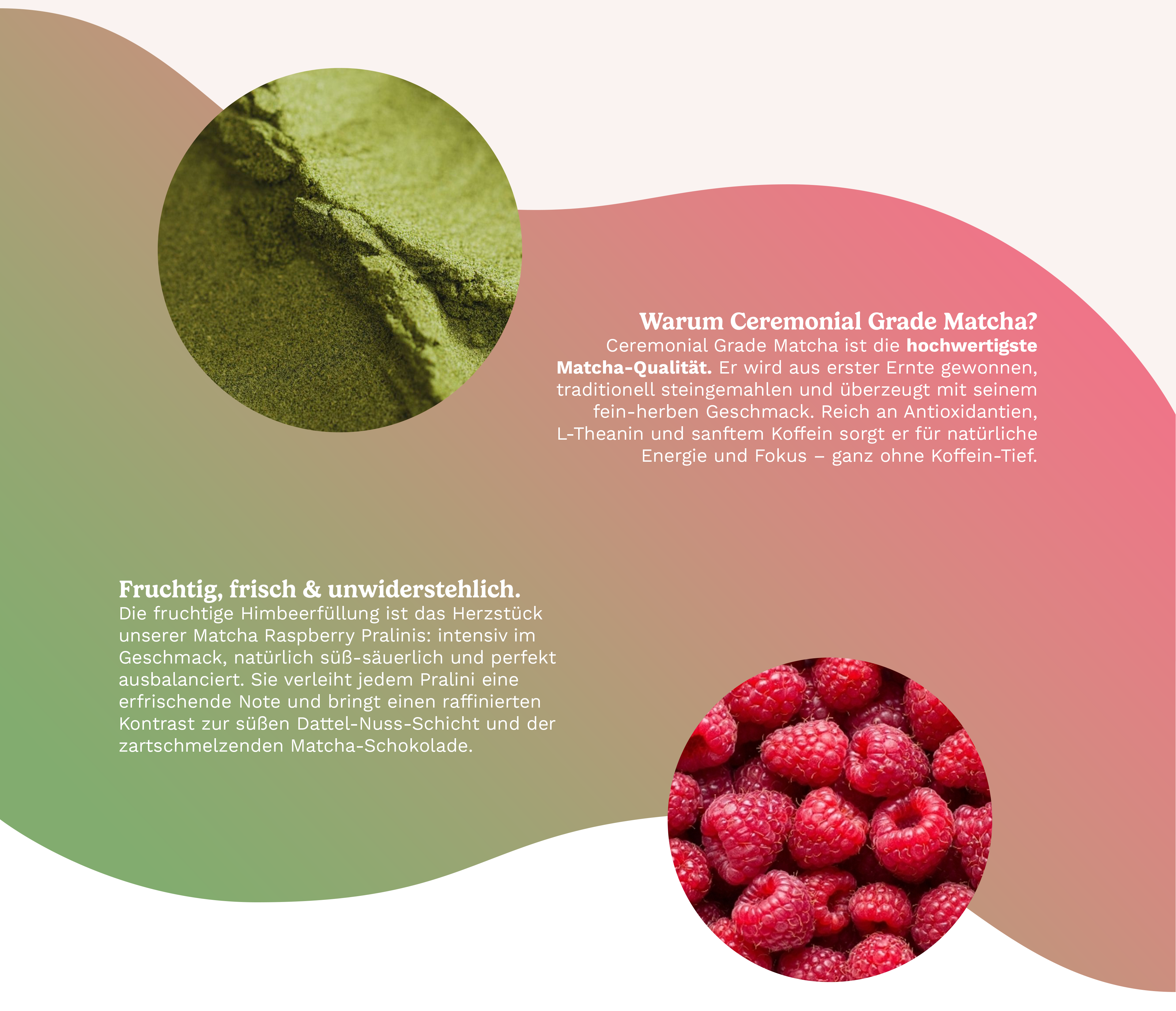 Die Kombination mit fruchtig-süßer Himbeere hat sie so begeistert, dass daraus unsere Matcha Raspberry Pralinis entstanden sind. Beim ersten Launch sofort ausverkauft, jetzt endlich zurück: noch besser, noch fruchtiger!