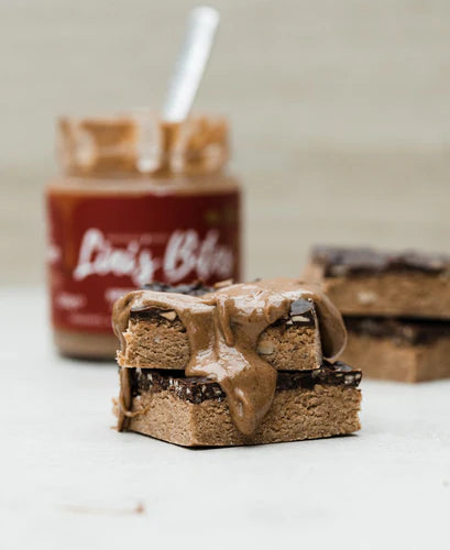 Die Mandel-Schokolade über den Teig geben und anschließend kalt stellen, bis dir Schokolade fest ist.